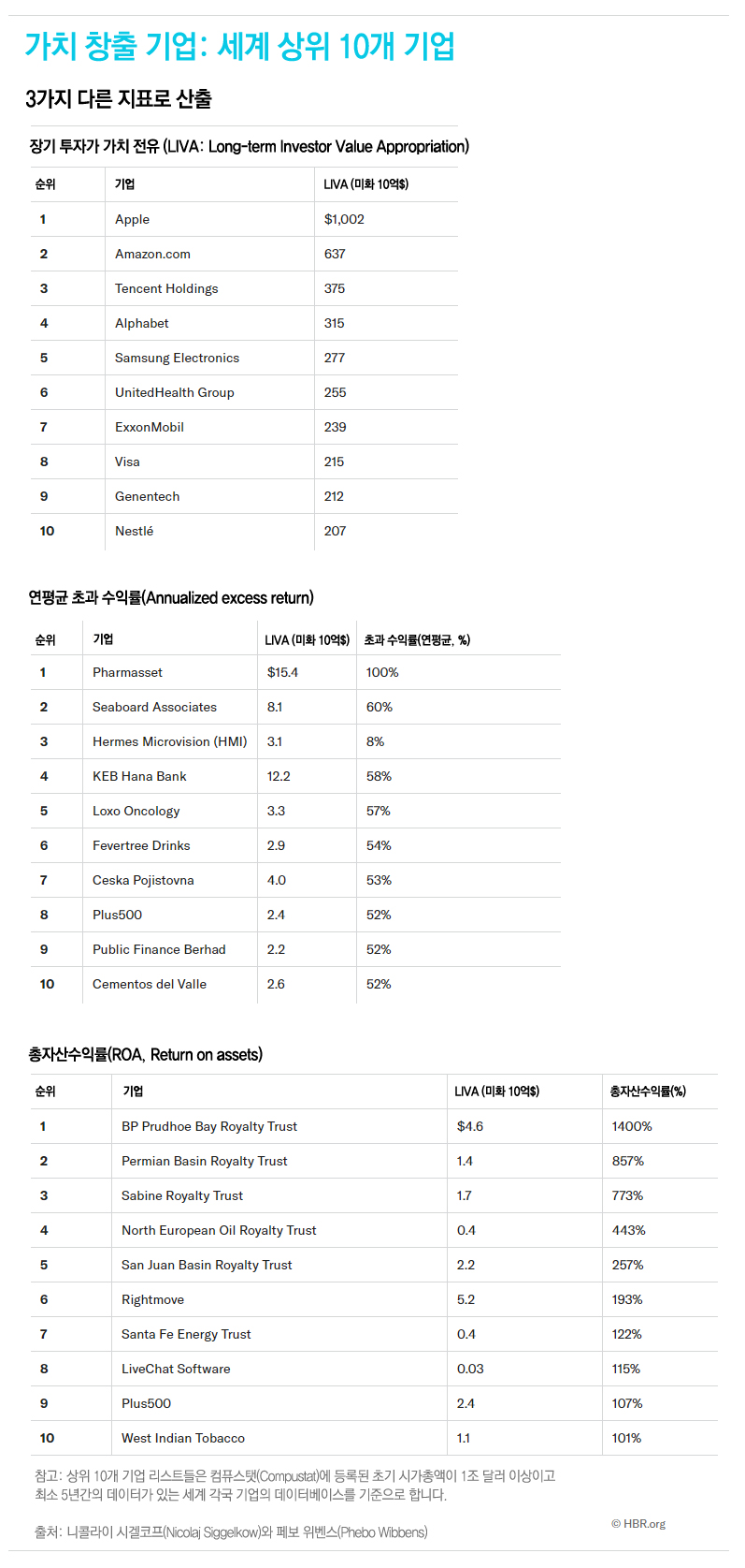 이 순위는 국가별, 지역별, 산업별로 최고 및 최악의 성과를 나타낸 기업들을 알아보는데 도움이 되도록 만든 세계 LIVA 데이터베이스에서 나왔다. 이 데이터베이스는 초기 시가 총액이 1억 달러 이상이며 최소 5년간의 데이터가